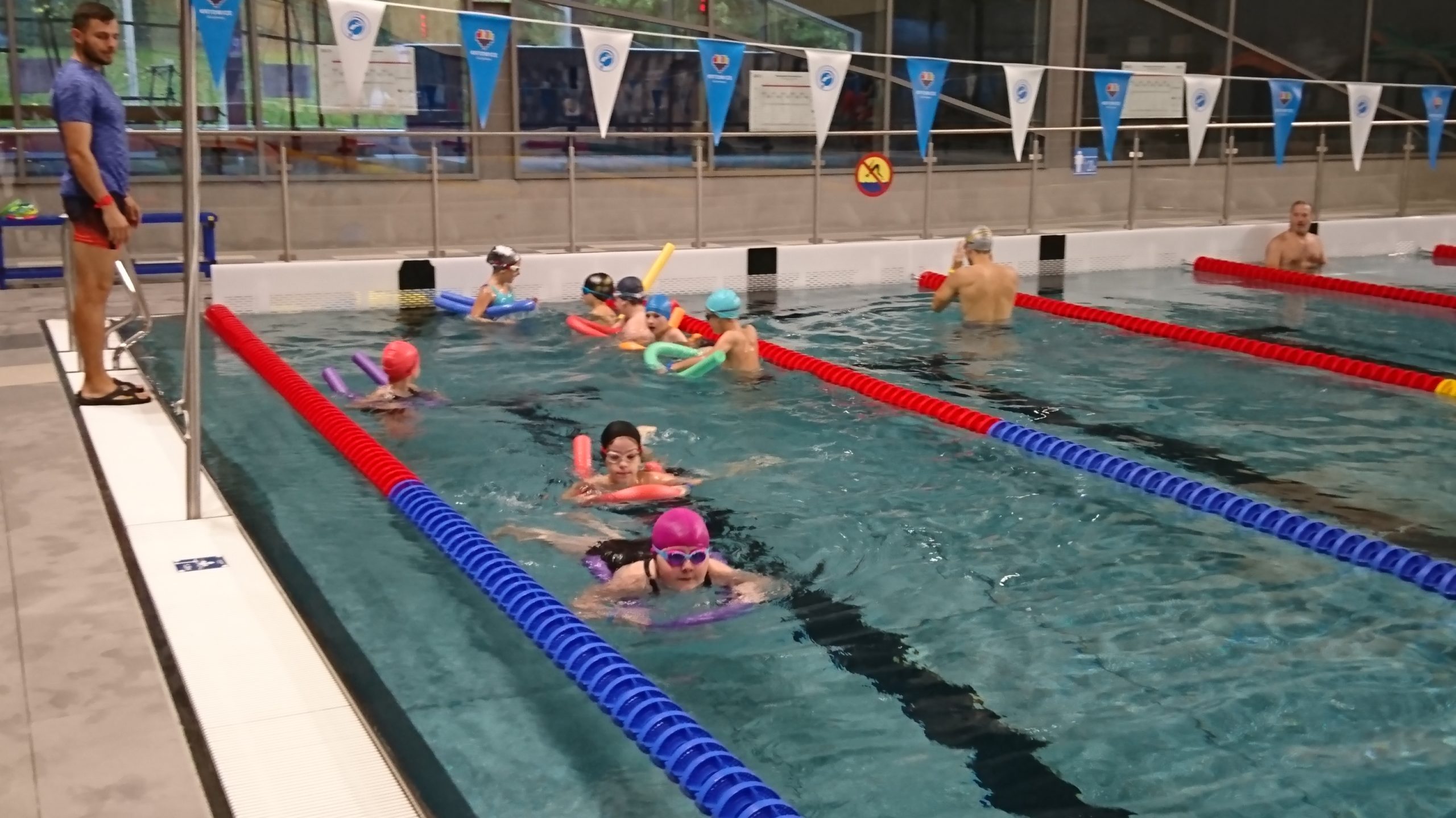 Uczniowie klasy 3 a i 3 b podczas zajęć WF na basenie Brynów. doskonalą umiejętności pływackie. Zajęcia realizowane w ramach programu Prezydenta Miasta Katowice dr Marcina Krupy „Jak ryba w wodzie”.